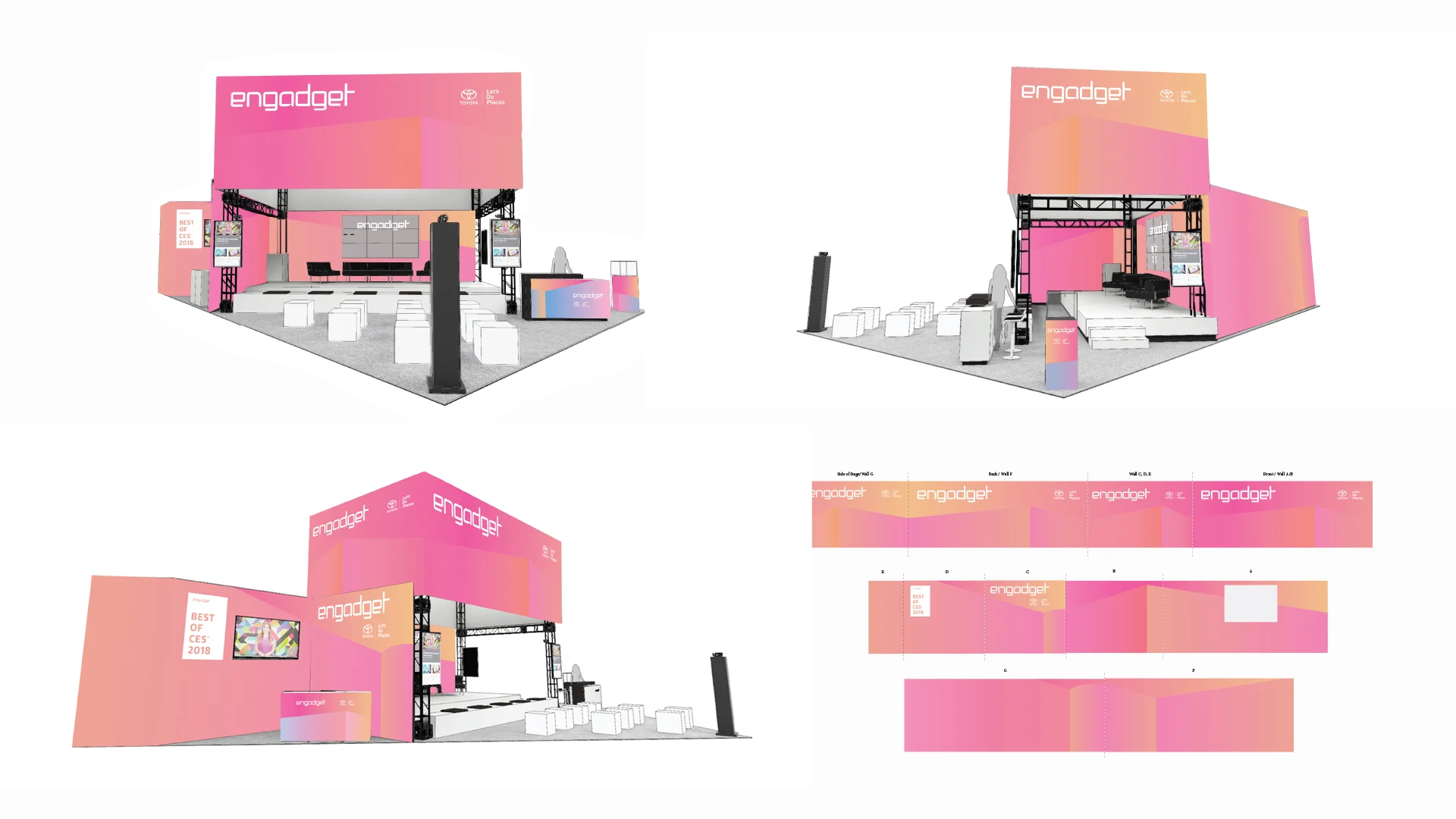 Each year we approached the Engadget stage, which played host to hundreds of hours of live streamed interviews, panels, and the CES award show, with an eye toward technology’s impact on humanity. Each year, color and light or the absence thereof, played a major role in the design process, resulting in prismatic crystal trophies (2015), massive sunset gradients (2018), and black and white geometric patterns that mirror the camouflage used to mask pre-release electronics (2017).